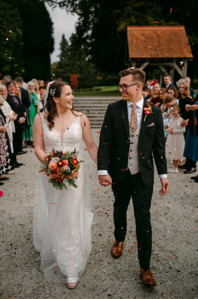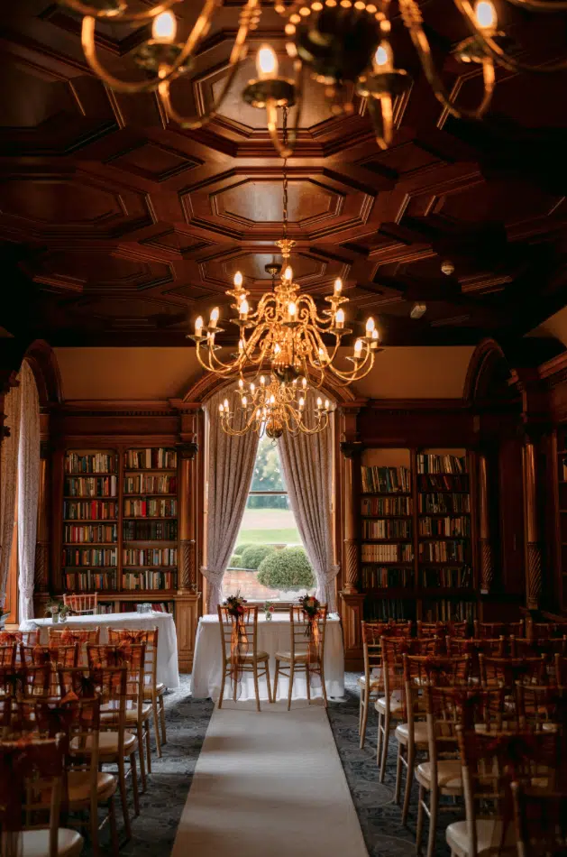 The perfect autumnal wedding, 75 guests witnessing the ceremony in the picturesque Library and everyone dancing the night away afterwards in the Garden Pavilion.