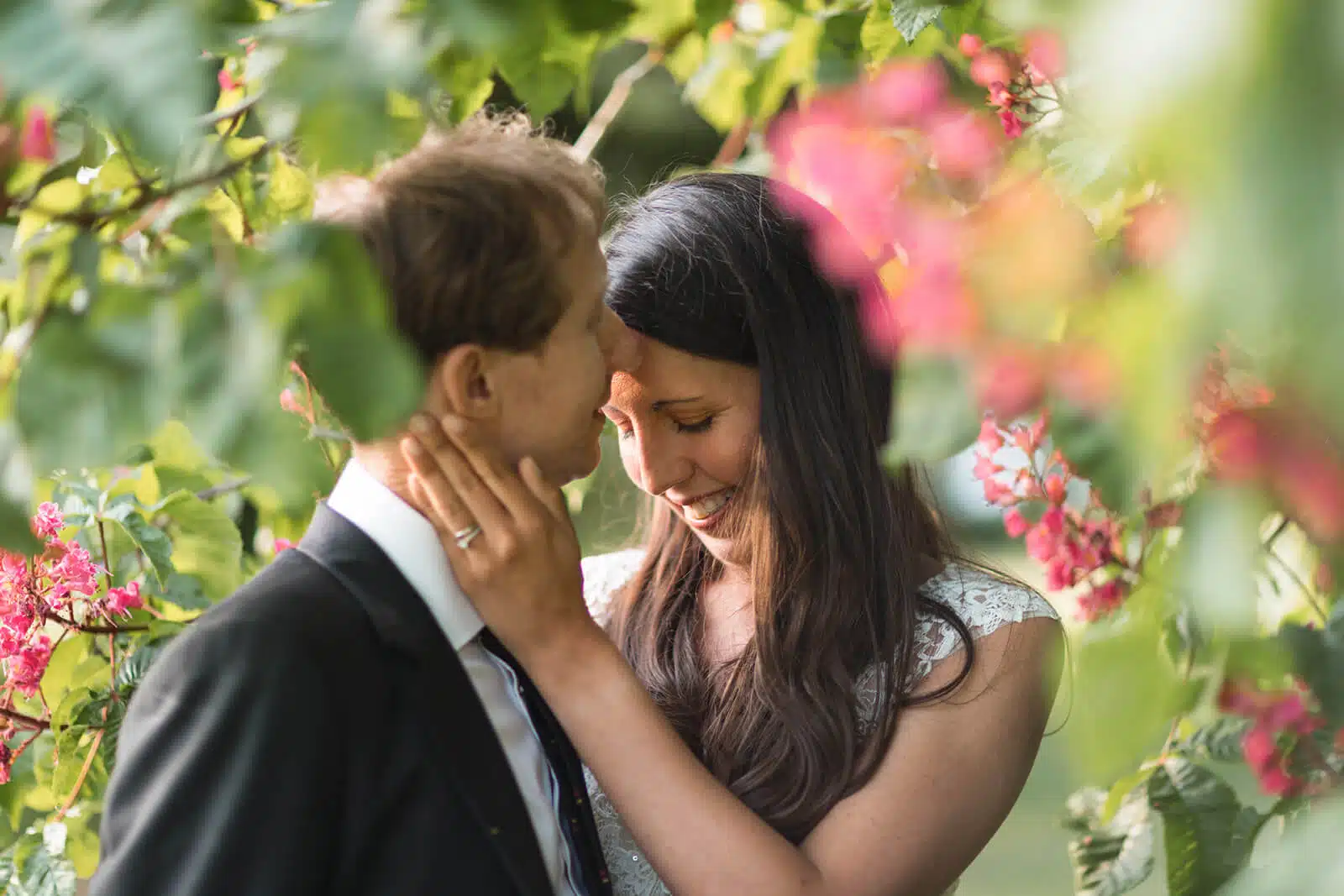 Under the trees and among the flowers outside. We also had a few photos in front of the arch.